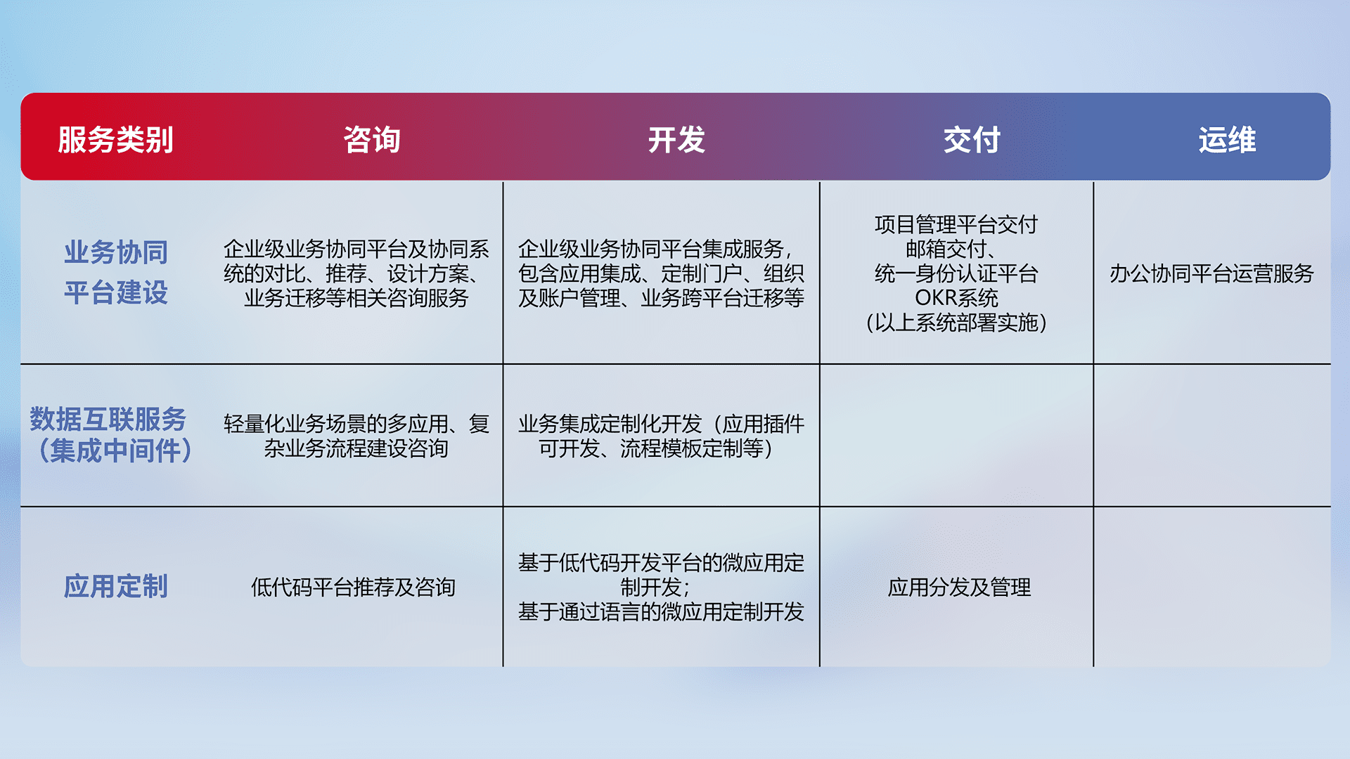 针对钉钉、、、企微、、、IDaas等平台级产品提供产品的规划、、、方案、、、、交付、、、、定制化开发等服务,,实现如统一协同办公、、、智能客户服务、、、、混合会议管理、、、、智能数据查询、、、等业务场景,,,实现数字化转型。。。。